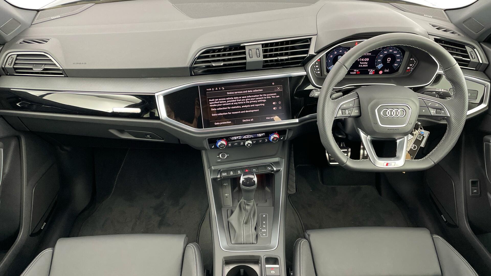 Audi Q3 SUV Black Edition 35 TFSI S tronic (ULEZ) registration CA25UKD with just 7,500 miles. Presented in superb condition with one previous owner and full Audi Approved service history, this Q3 combines sharp Black Edition styling with smooth S tronic performance and outstanding efficiency for city and motorway alike. Inside, comfort and technology take centre stage with heated front seats, a crystal-clear rear camera for effortless manoeuvring, Sonos 3D premium sound for immersive audio, seamless Bluetooth connectivity and convenient cruise control for relaxed long-distance driving.
